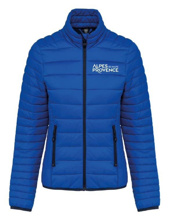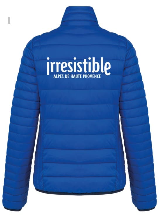 Doudoune femme à capuche bleu royal. Marquage blanc brodé Alpes de Haute Provence coté cœur et Irrésistible au dos.