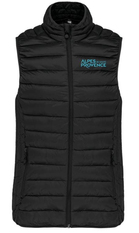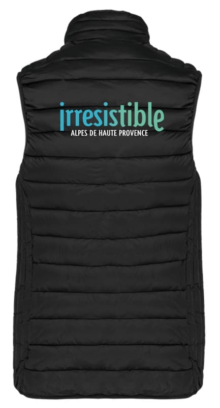 Doudoune sans manches noire homme. Marquage brodé Alpes de Haute Provence coté cœur et Irrésistible au dos.