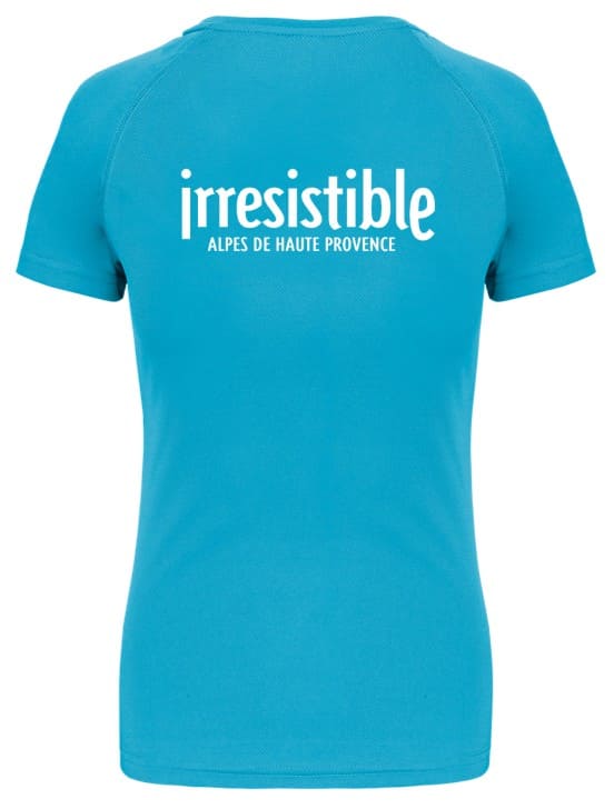 Tshirt sport coupe femme bleu turquoise logo Irrésistible blanc cœur et dos.