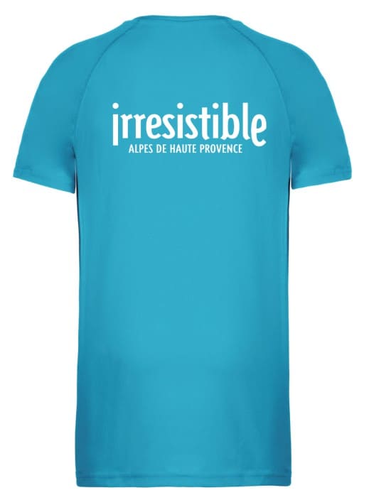 Tshirt sport coupe homme bleu turquoise logo Irrésistible blanc cœur et dos.